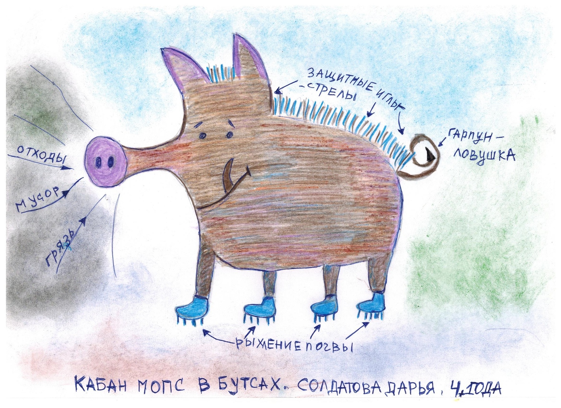 Кабан по имени МОПС (Мощная Очистительная Природная Сила) носом как пылесосом затягивает в себя весь окружающий мусор, перерабатывает его в полезные для всех лесных жителей строительные и укрывные материалы (создание безопасного и теплого жилища), а также упаковку и емкости для хранения запасов.