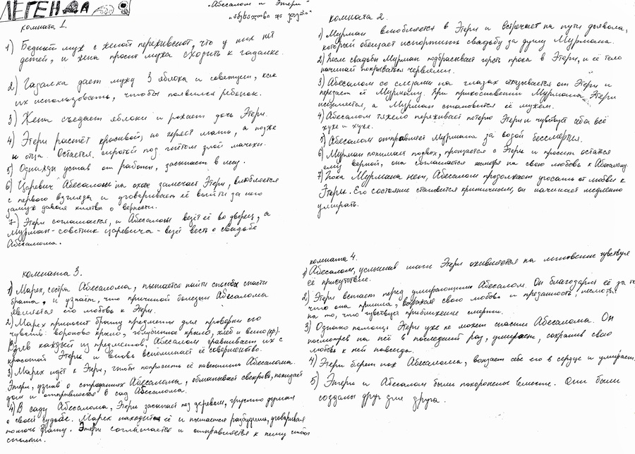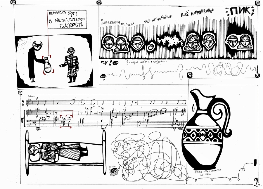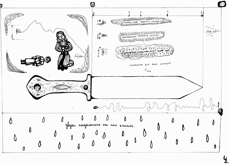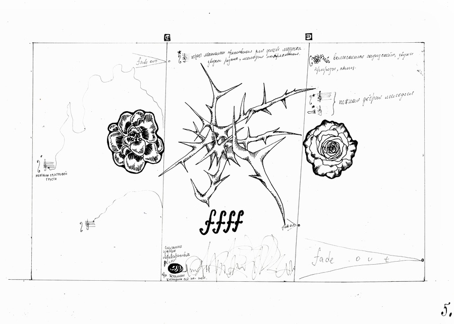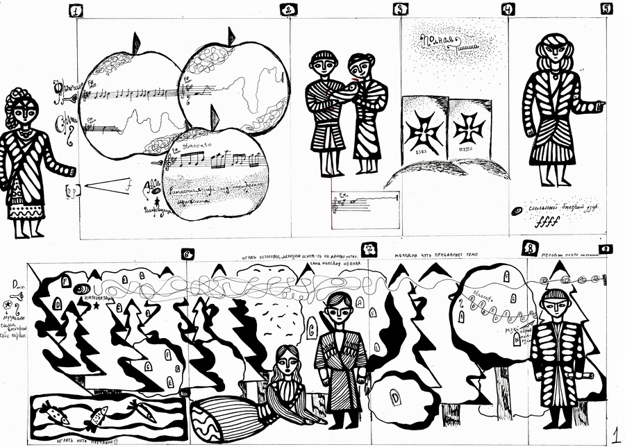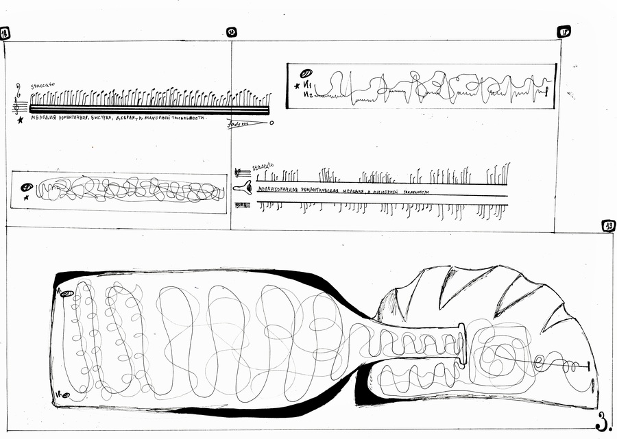 Графическая партитура передает сюжет сказки с помощью визуальных образов и символов, которые служат руководством для исполнителей в создании музыкального повествования. Каждый инструмент исполняет свою уникальную роль в этом аудио-визуальном повествовании.