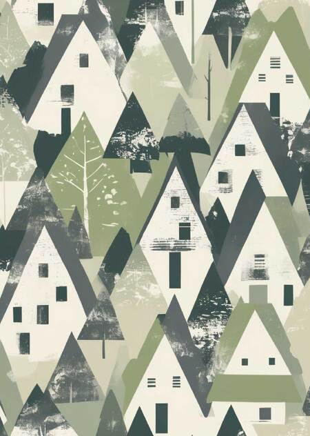Промт: minimalistic pattern with large textured triangular houses in the forest drawn in beige and dark gray colors on a green background, vector graphic Reference image: https://imgur.com/VKsDZhk Использованные инструменты: Leonardo AI