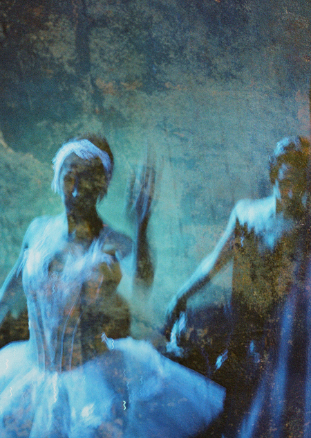 II Акт: «Цианотипия». Этот ранний бессеребряный способ ручной печати, дающий изображение голубого оттенка, по-другому называют «Берлинская лазурь». Старинная техника цианотипии созвучна классическому балету в своей архаичности и выбрана не случайно. Синий цвет может быть прочтён как слово, истолкован как самостоятельный знак или символ. Символика синего цвета отсылает зрителя к мифологии, где он ассоциируется с небесами — обиталищем богов, ангелов и духов. Сопряженные с синим цветом значения — таинственность и мистицизм, — помогают мне двигаться во времени вслед за ускользающей Жизелью или Миртой, обращаясь к возможностям человеческой памяти и воображения.