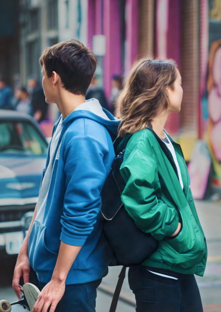 Промпт: «Bright urban street photography, conveying the essence of youth and relaxed coolness. Young students, a young man and a young woman, stand side by side, with their backs to the camera, creating an intriguing and intimate scene. A man dressed in a casual blue hoodie leans his hands on a skateboard, radiating carefree confidence. The girl is wearing a bright green oversize jacket and carries a backpack that demonstrates her practicality. The background shows a busy city street with a vintage car parked nearby and colorful graffiti decorating the walls. The atmosphere is filled with the energy of youth and a sense of carelessness, while the lively pulse of the city creates an energetic backdrop for this scene».
