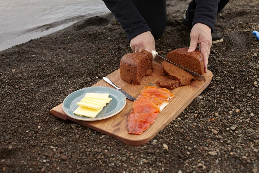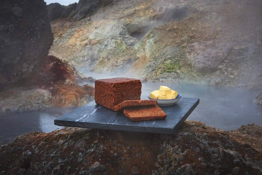 Volcanic bread «hraunbraud» (chrunbrud) has been produced in Iceland for over 900 years: rust dough is buried underground for 24 hours and is prepared on geothermal pairs resulting from nearby volcanoes.