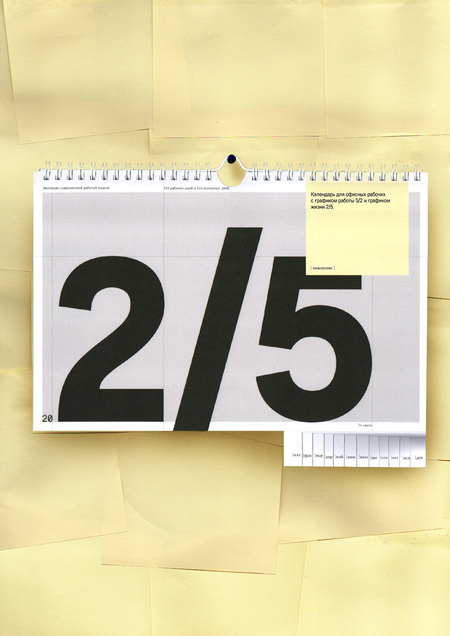 Календарь-ирония над устаревшей концепцией рабочей недели, параллельно рассказывающий об ее эволюции и новых корпоративных терминах. С помощью переосмысления календарной сетки, проект передает ощущение от жизни с графиком 5/2, где неделя состоит как будто только из субботы и воскресенья.