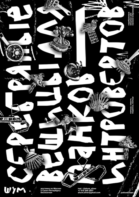 The project consists of a small collection of silver jewelry. The brand’s legend for a young informal audience is based on modern culture codes, and it is based on songs and aesthetics of the group Give Tank (!). The product is accompanied by a measurement that produces a visual environment, mood and recognition of the SHM brand.