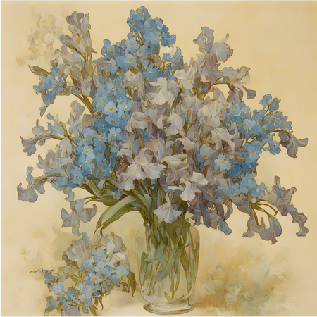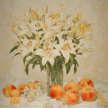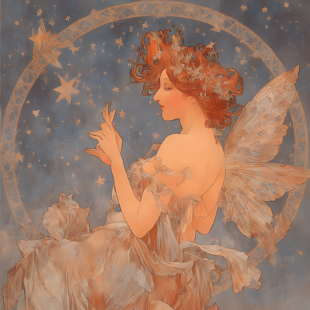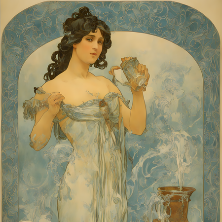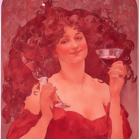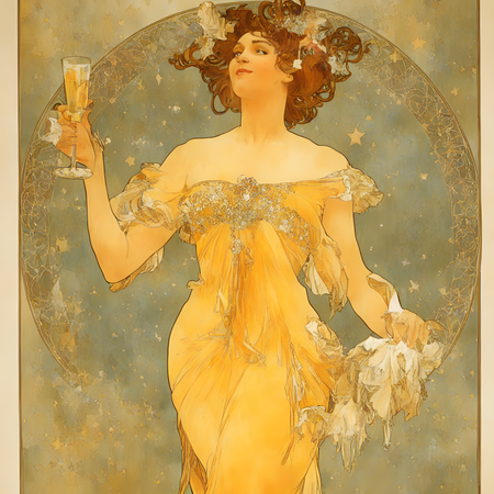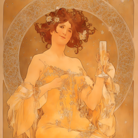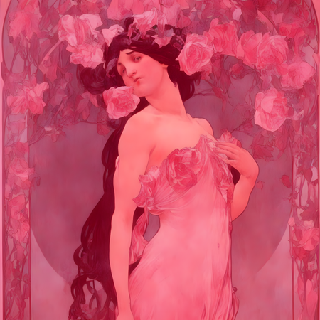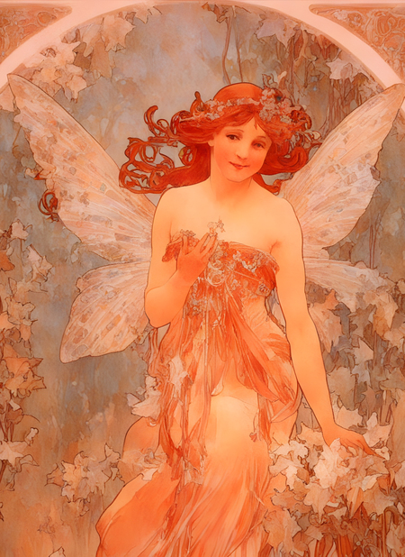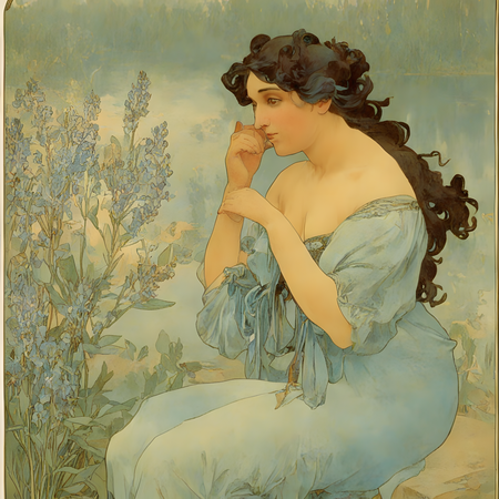 Сначала я просила Stable Diffusion создать пару работ описывающих красивых женщин, чтобы убедиться, что нейросеть удачно обучилась нежному и утонченному стиль Альфонса Мухи.