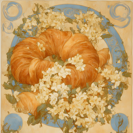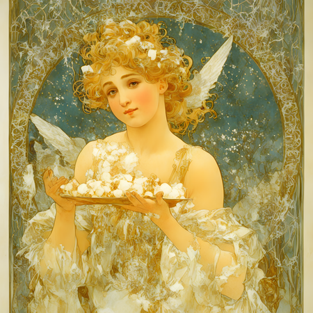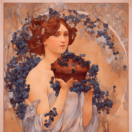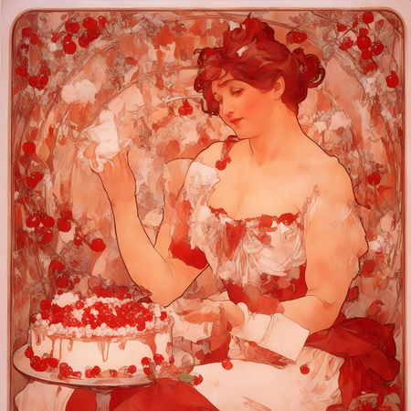 В этом проекте удалось совместить образ прекрасной красавицы с обложки реклам Альфонса Мухи со сладкими изделиями, в некоторых случаях романтизируя образ модели и лакомства. В итоге получилась акварельная серия из ярких и нежных девушек из старинных сказок с пожелтевшими страницами. Stable Difffusion смогла обучиться всем отличительным чертам художника Альфонса Мухи: мягкие и нежные переливы акварельных оттенков, четкий серый или коричневый контур силуэта, томный взгляд и округлое тело модели, геометрические и природные сплетения орнамента в стиле модерн. К сожалению, в датасете содержалось довольно мало работ, где отчетливо прорисованы кисти рук; в большинстве своем они были скрыты драпировкой или терялись в волосах моделей, из-за чего возникли вольные интерпретации нейросети на тему сплетения пальцев рук.