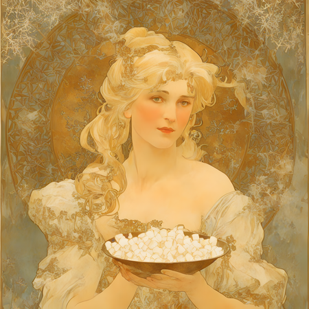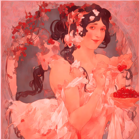 С детства меня восхищало творчество Альфонса Мухи. Мягкие переливы оттенков кожи, утончённые узоры цветов и растений, теплые и солнечные тона его работ и живость изображаемых женщин. Альфонс Муха часто рисовал рекламу изображая женщин с рекламируемым предметом, будь то велосипед или сигареты. Его работы вдохновили меня создать серию генеративных работ, посвящённую сказочным женщинам в сочетании со сладкими угощениями.