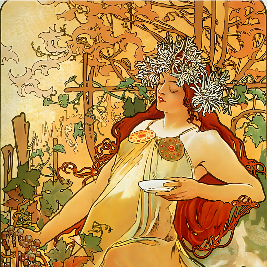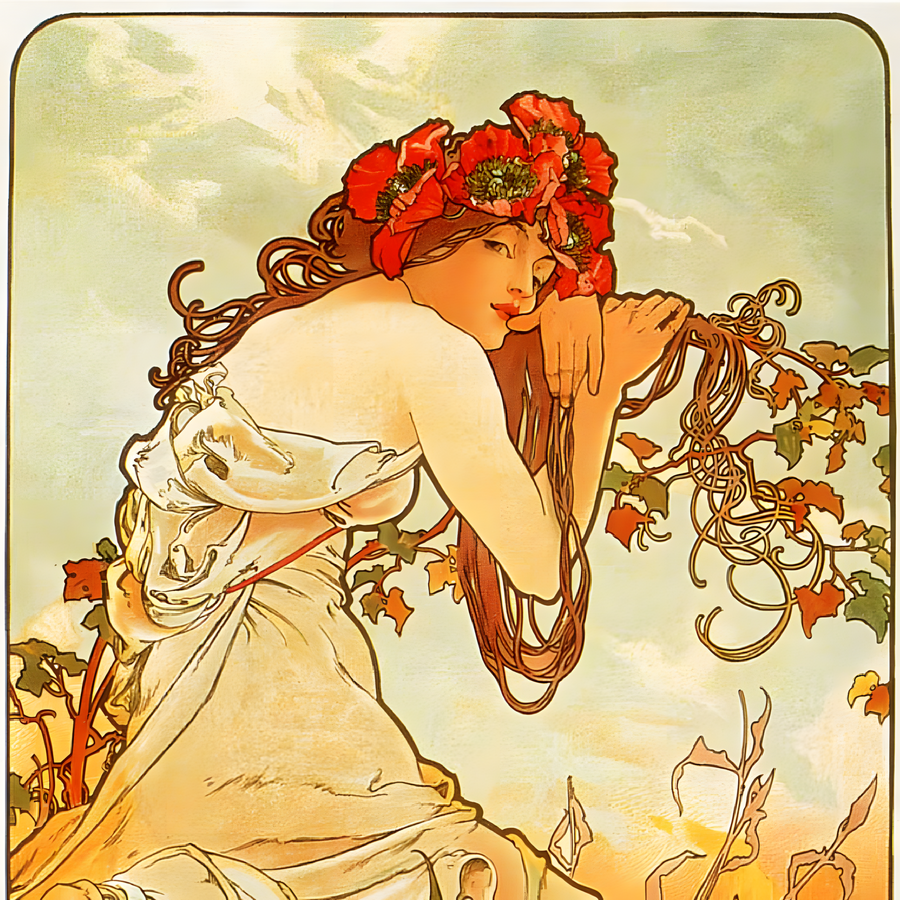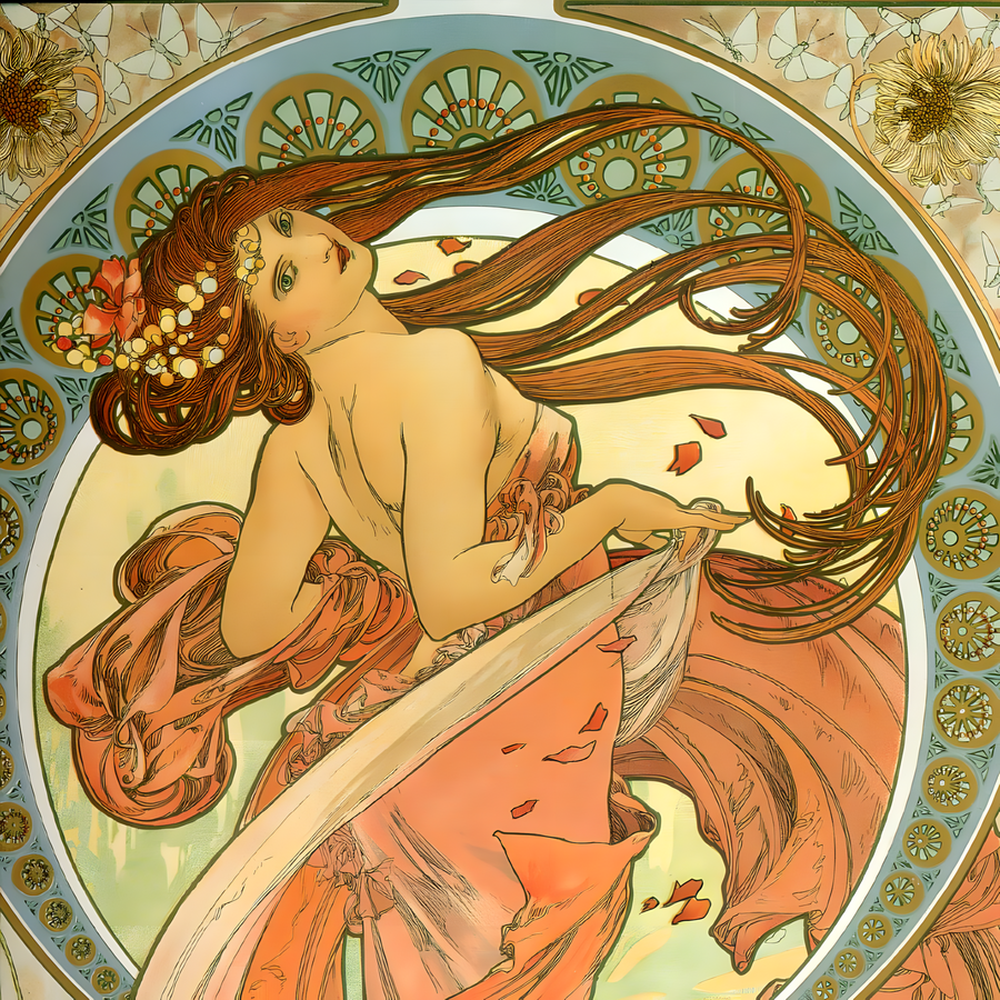 Фрагменты работ Альфонса Марии Мухи: Времена года, Осень, Лето; Танец