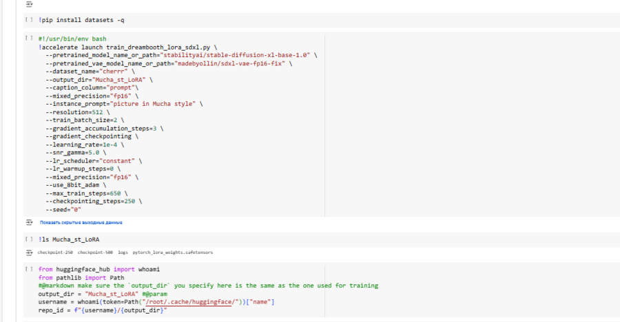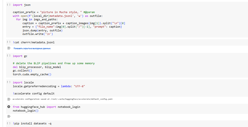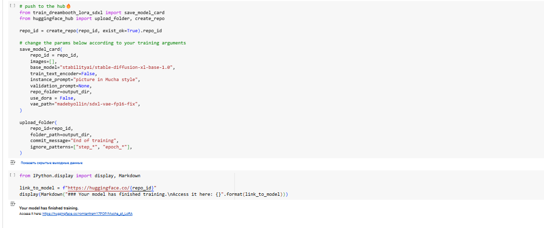 Потом я создала файл metadata.jsonl, который содержит пути к изображениям и соответствующие подписи. Необходимо удалить модель BLIP, чтобы освободить память. После настройки я запустила обучение модели Stable Diffusion XL. Обучив модель, я сохранила её на Hugging Face Hub для удобного пользования ею в любом блокноте Google Colab.