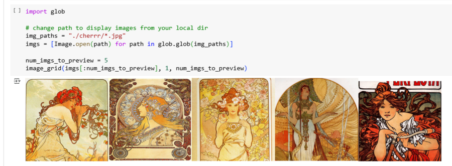 Я обучала модель Stable Diffusion XL с использованием техники LoRA (Low-Rank Adaptation). В начале необходимо удостоверится в возможности использования GPU, затем установить нужные зависимости. После этого я создала общую папку в корне Google Colab для датасета и скопировала туда изображения из личного архива. Датасет состоит из работ Альфонса Мухи. При помощи функции image_grid можно продемонстрировать несколько изображений из датасета, чтобы убедиться, что данные загружены корректно. Чтобы обучить модель промтам, я сгенерировала описания для каждого изображения с помощью модели BLIP (Bootstrapped Language-Image Pretraining).