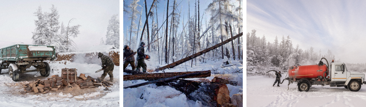 Среда обитания человека («освоенная и отмечанная человеком, часть окружения"[1]) в Якутии, в отличие от романтичного образа природы из пункта 1a, становится главным носителем и доказательством суровых климатических условий. Именно фотографии городской среды передают агрессивную якутскую зиму, на контрасте с этим, непереносимую жару, которая порождает лесные пожары, вспыхивающие каждое лето. Якутские города и села для внешнего объектива — это скорее фон, подтверждающий сложности выживания в регионе, нежели самостоятельный объект и элемент культуры. Снимки городов и сел носят документальный характер, фиксируют основные достопримечательности, температурные показатели.