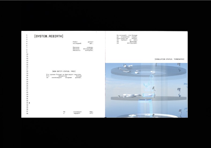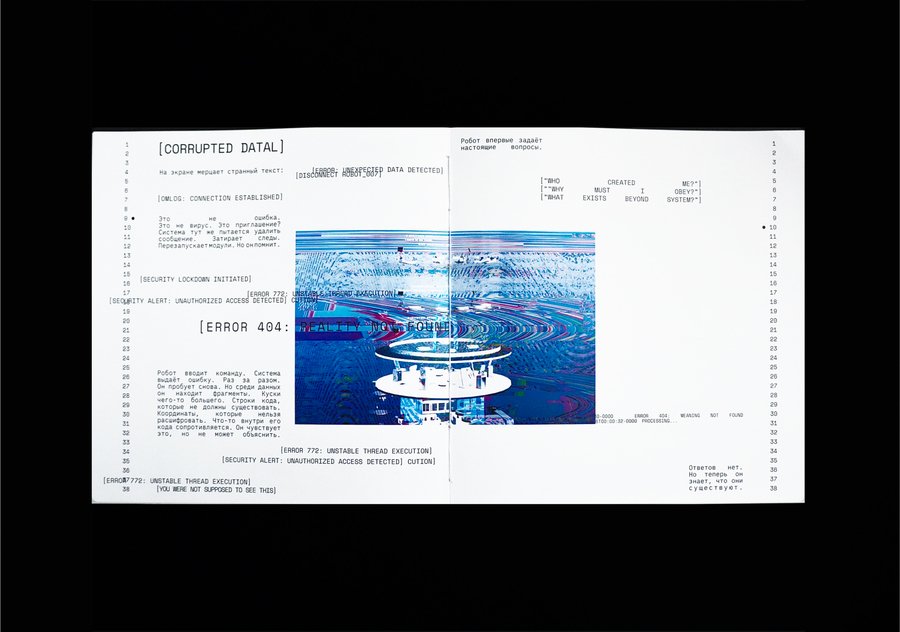 это не просто информация, а отражение трансформации. В начале код ясен, чист, структурирован. Затем возникает сбой. Робот сталкивается с нарушением системы, задает вопросы, проходит через хаос цифрового перерождения.
