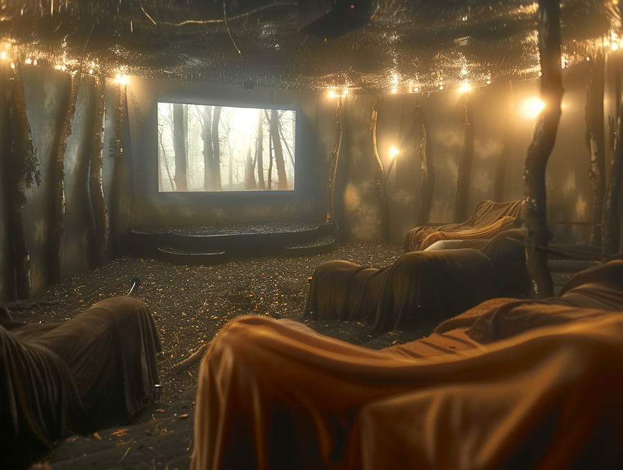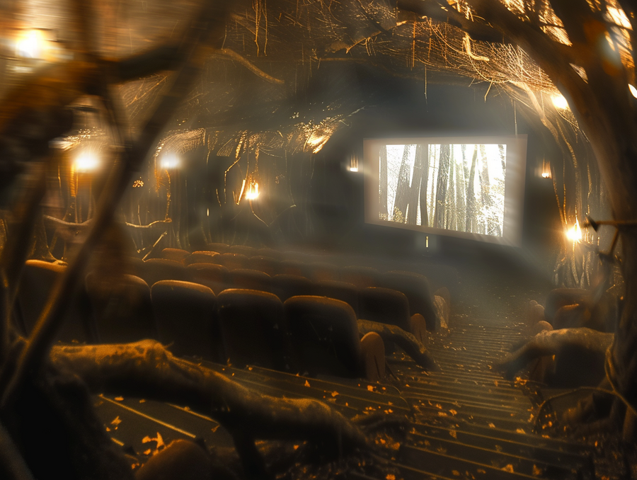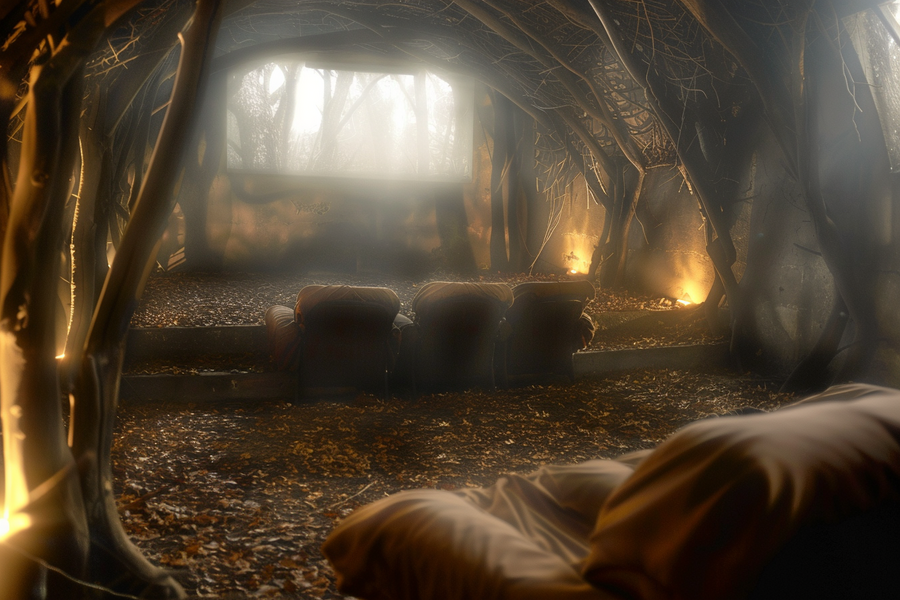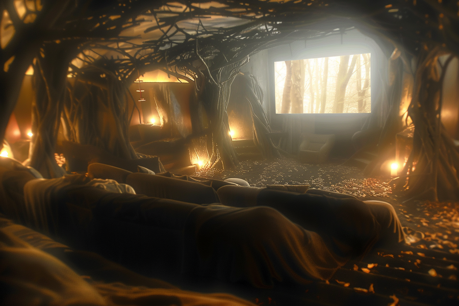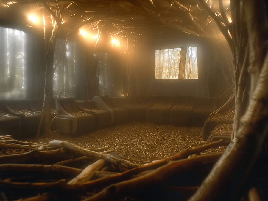 Промты к изображению сет-дизайна кинозала для премьеры: 1-5. A movie room decorated like a forest spirit’s dwelling, all in dry branches