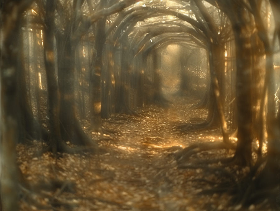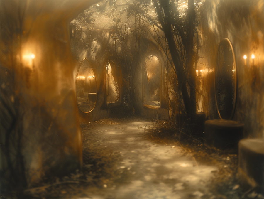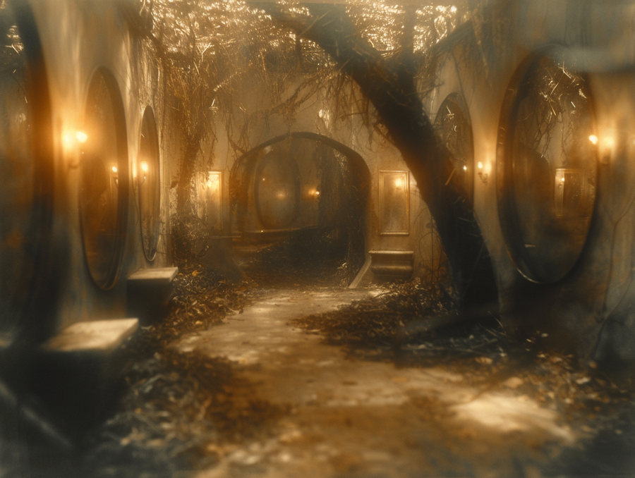 Промты к изображениям сет-дизайна: 1. Forest spirit’s dwelling, gray branches, brown dry branches, a strange nest-bed in the middle 2. Forest spirit’s dwelling, gray: 2 branches, brown dry branches, a strange nest-bed in the middle 3. Dwelling of the forest spirit, gray branches, brown dry branches, a strange bed in the middle, all in spirals and mirror mazes 4. Forest spirit dwelling, gray branches, brown dry branches, lots of mirrors around in the shape of a labyrinth 5-6. Forest spirit dwelling, gray branches, brown dry branches, lots of mirrors around in the shape of a labyrinth