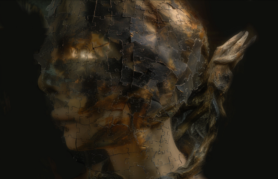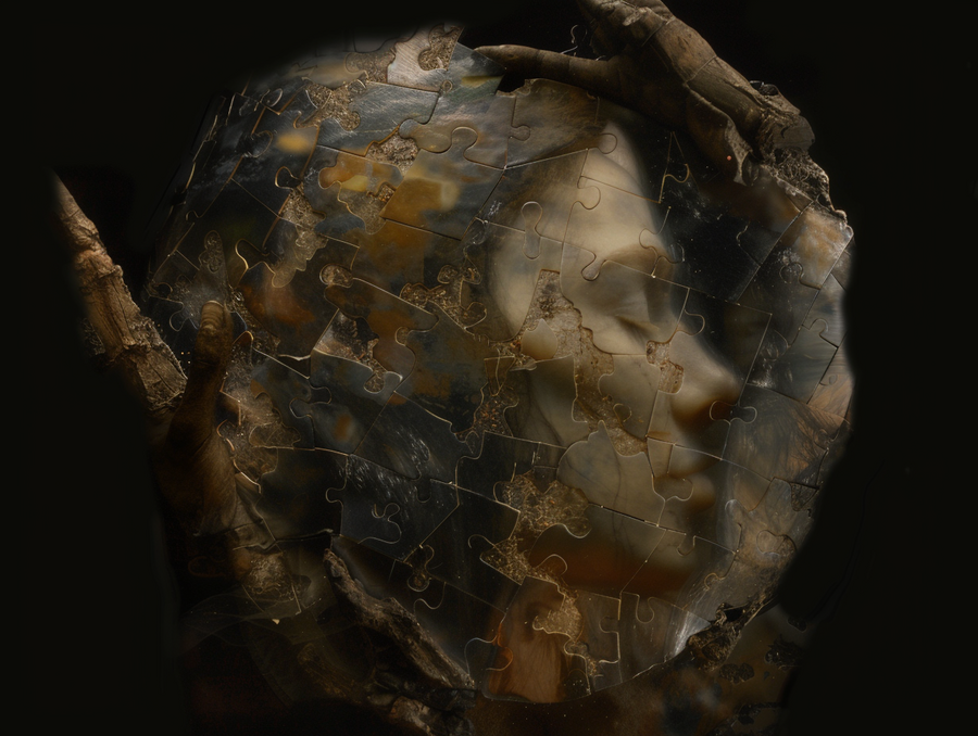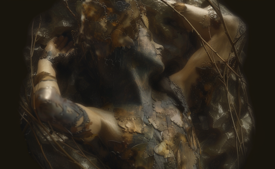 1-2. poster for an experimental movie about a forest spirit, a full body the forest spirit lies on dry branches, the forest spirit is made of puzzles with landscapes on them 3. poster for an experimental movie about a forest spirit, close-up the forest spirit lies on dry branches, the forest spirit is made of puzzles with landscapes on them 4. poster for experimental forest spirit movie, forest spirit lying on dry branches, blur: 2, grain, vhs 5-6. poster for an experimental movie about a forest spirit, the forest spirit lies on dry branches, the forest spirit is made of puzzles with landscapes on them