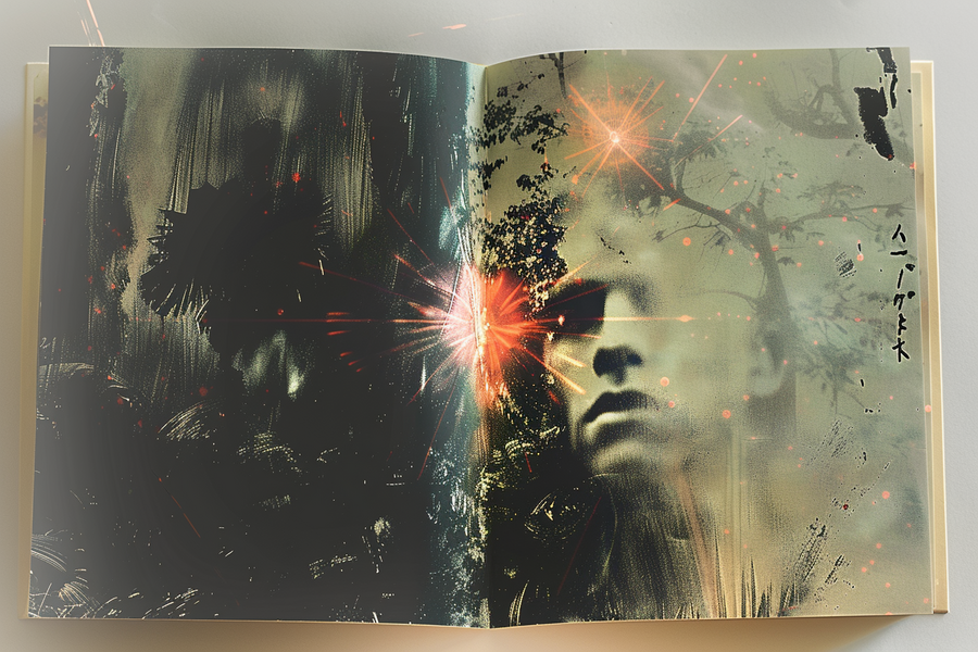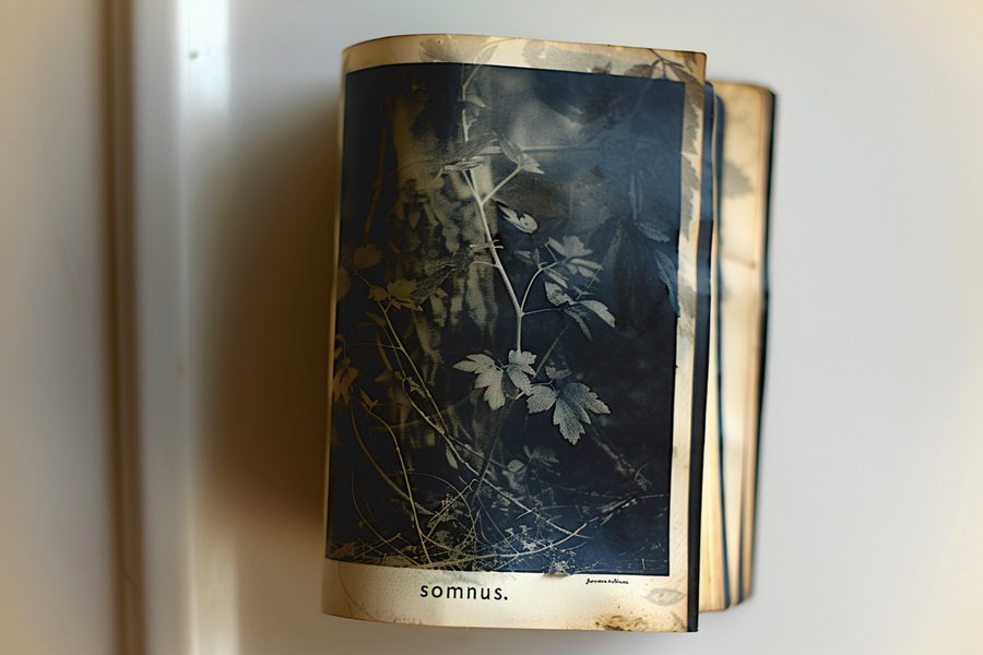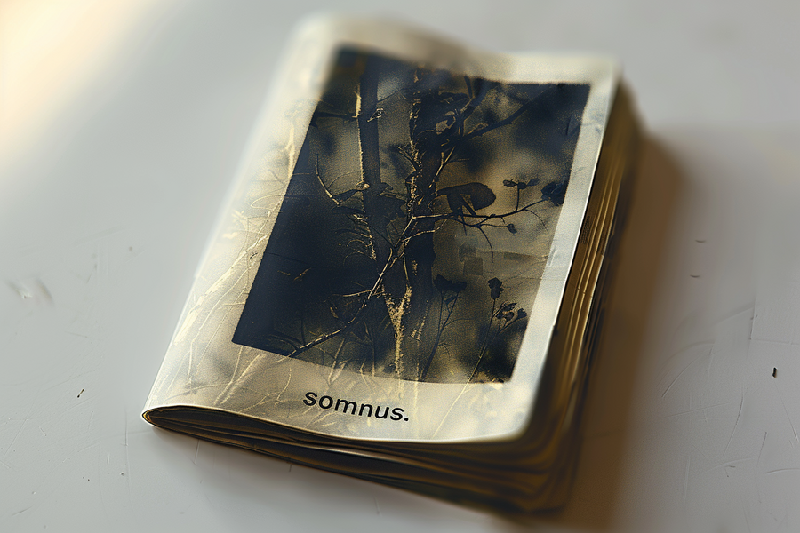 Промты к буклетам: 1. A booklet with this image printed on it, labeled «somnus.» 2-4. The booklet on which this image is printed 5. A booklet with this image printed on it, labeled «somnus.»