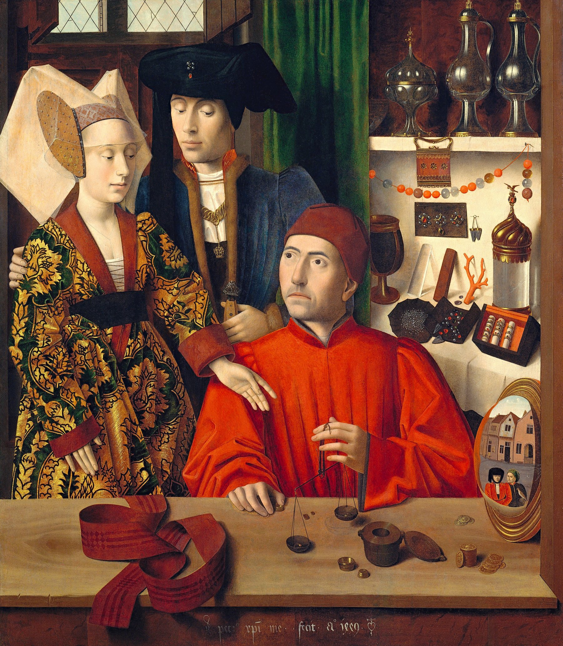 Картина «Ювелир в своей лавке» Петруса Кристуса (1449) — одна из самых любопытных жанровых сцен Северного Возрождения. С большим вниманием художник выписывает мельчайшие предметы — броши, бусы на полке, драгоценные камни и жемчуг. За прилавком ювелир взвешивает обручальное кольцо для пары знатных клиентов; здесь же раскиданы монеты и стоит зеркало, в котором отражаются горожане за окном. На руке у женщины — сокол, символ жадности и гордости — намек на несовершенство мира. Сцена в лавке, наоборот, является свидетельством благородства и безупречности ювелирного ремесла.