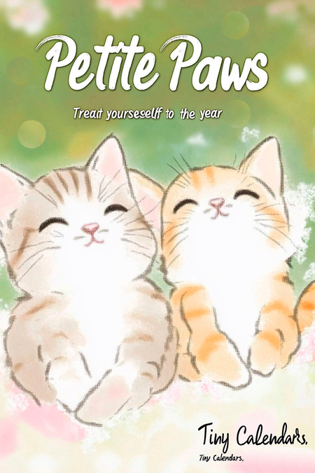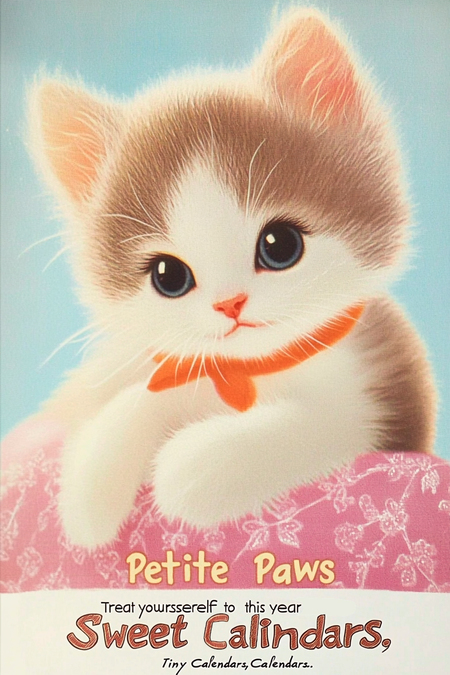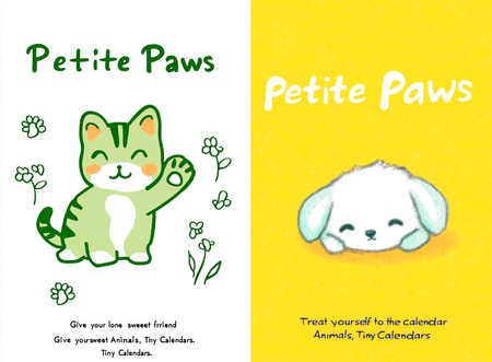 Design 1: Create a poster advertising «Petite Paws» miniature calendars. Poster should feature a animal (kitten, puppy, bunny). Very simple images of animals, these can be just outlines and outlines. Use a soft color palette and a whimsical font. Include taglines like «Treat yourself to the calendar this year» and «Sweet Animals, Tiny Calendars.» The overall style should be charming and inviting. Design 2: Create a poster advertising «Petite Paws» miniature calendars. Poster should feature a different adorable animal (kitten, puppy, bunny). Use a soft color palette and a whimsical font. Include taglines like «Treat yourself to the calendar this year,» and «Sweet Animals, Tiny Calendars.» The overall style should be charming and inviting.