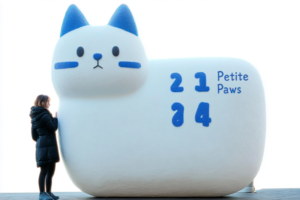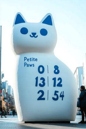 Design 1 and 2: Create a mascot: a minimalist cat with very simple shapes, standing as an outdoor art piece. The calendar numbers are written on the cat’s stomach in order (1,2,3,4, etc.). The mascot is on a busy street. the cat is very large, there is a person standing next to him who is half its size and looking at her