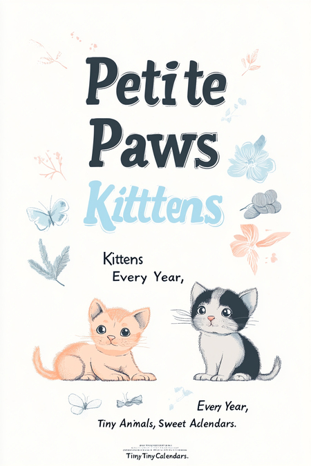 Design 1: Create a poster advertising «Petite Paws» miniature calendars. Poster should feature a different adorable animal (kitten, puppy, bunny). Use a soft color palette and a whimsical font. Include taglines like «Kittens Every Year,» «Puppies Every Year,» and «Sweet Animals, Tiny Calendars.» The overall style should be charming and inviting. Design 2: Create a poster advertising «Petite Paws» miniature calendars. Poster should feature a animal (kitten, puppy, bunny). Very simple images of animals, these can be just outlines and outlines. Use a soft color palette and a whimsical font. Include taglines like «Treat yourself to the calendar this year» and «Sweet Animals, Tiny Calendars.» The overall style should be charming and inviting.