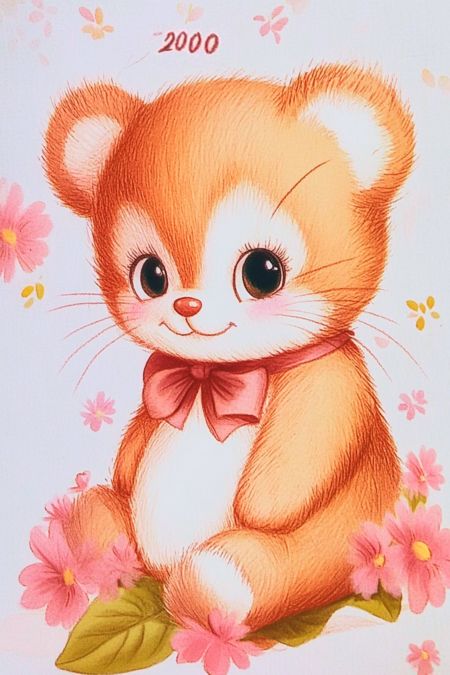 Design 1: simple drawing in pastel colors of a teddy bear on a background of flowers, cartoon style, looking at the camera, pastel shades of the image. In the left corner there is the inscription «2000». Design 2: simple drawing in pastel colors of a kitten on a background of flowers, cartoon style, looking at the camera, pastel shades of the image. In the left corner there is the inscription «2008».
