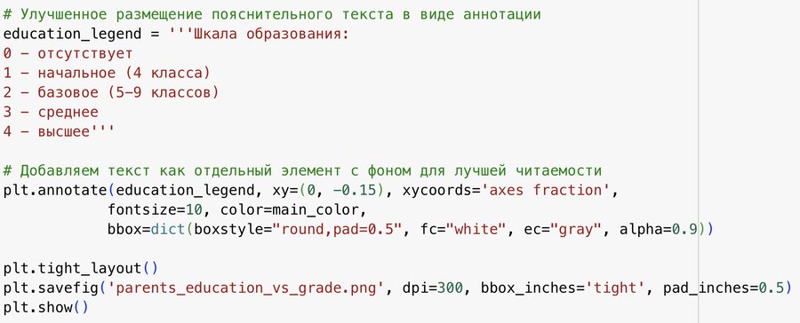 Интересно, что вопреки ожиданиям, не всегда высокий уровень образования обоих родителей приводит к наилучшим результатам. Это может указывать на влияние дополнительных факторов, таких как мотивация, родительский контроль или доступность образовательных ресурсов.