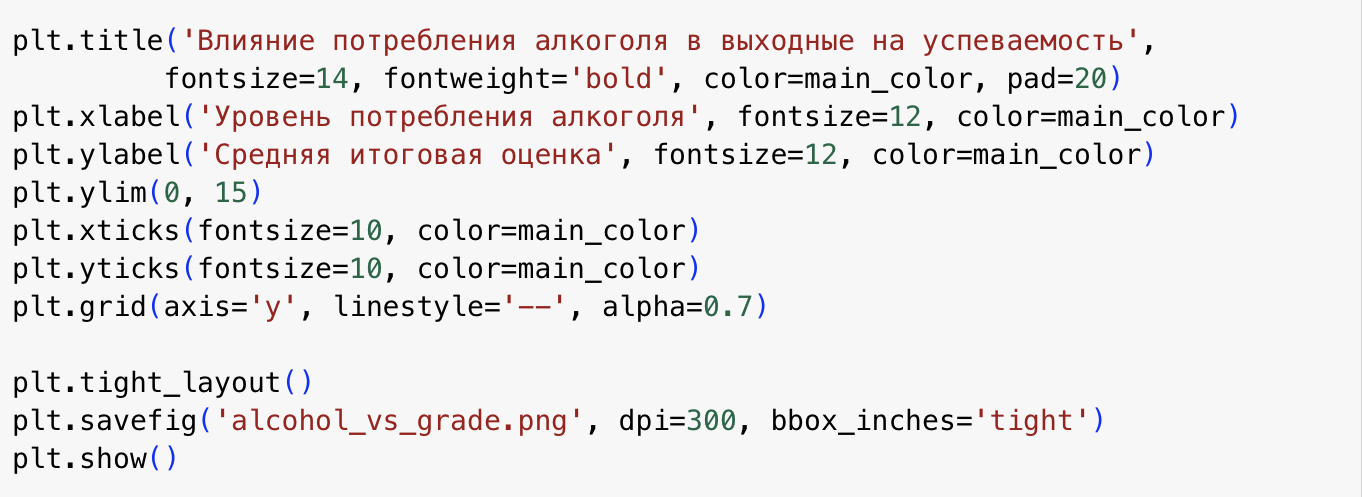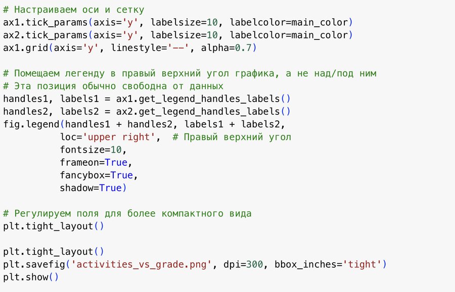 • Единую цветовую палитру для всех графиков • Согласованный стиль заголовков и подписей • Четкие обозначения осей и легенды • Добавление средних значений непосредственно на графики для улучшения восприятия