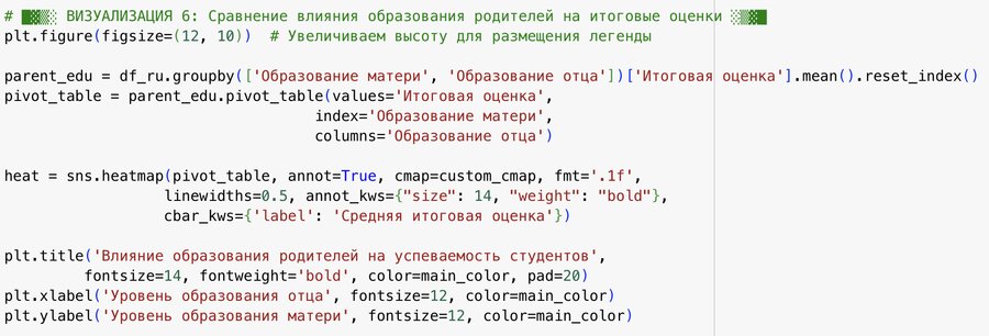 Тепловая карта показывает, как различные комбинации уровней образования матери и отца влияют на средние оценки студентов. Наиболее высокие результаты (16.0) наблюдаются у студентов, чьи матери имеют начальное образование (уровень 1), а отцы — отсутствие формального образования (уровень 0). Второй по величине показатель (15.0) — у студентов, чьи матери не имеют формального образования, а отцы имеют базовое образование (уровень 2).