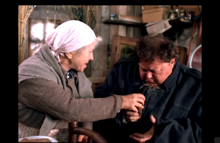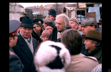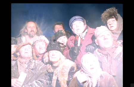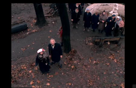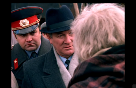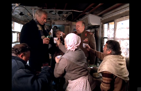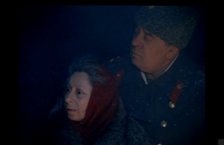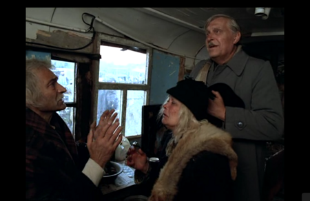Рязанов выстраивает композицию кадра так, что каждый персонаж словно замурован в своей роли — бедняка, сумасшедшего, бывшего офицера, старухи, интеллигента. Они собраны в одном кадре, но не объединены ни действием, ни пространственной логикой.