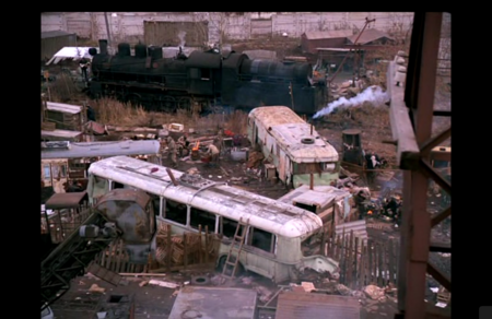 Пространство кадра заполняют руины индустриальной утопии, обломки техники, огни города вдали. Всё это становится метафорой конца.