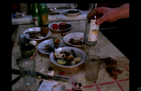 В фильме повторяется мотив совместной трапезы. В этих сценах персонажи делятся последним, поднимают тосты, поют. Это работает, как ритуал выживания — еда, водка, смех становятся одной из немногочисленных форм поддержки.