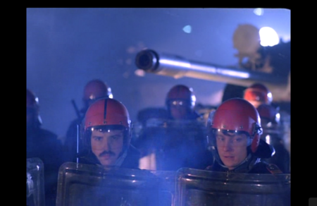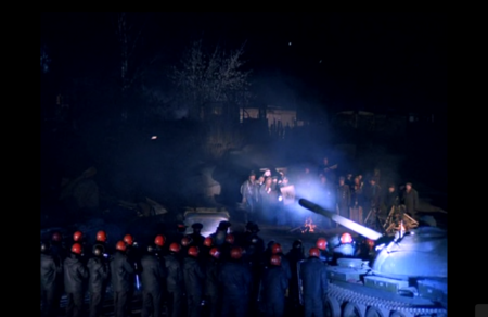 Кадры с танком и солдатами в красных касках создают сильный визуальный контраст: Люди в касках сливаются в единую массу, без лиц и эмоций. Камера снова возвышается над героями и берет общий план, показывая весь масштаб происходящего.