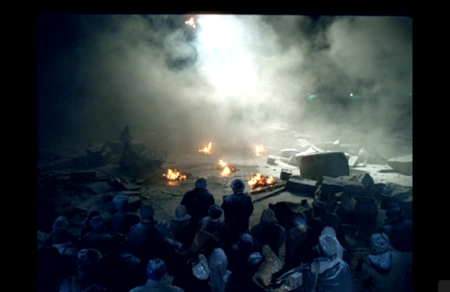 Цветовая палитра и фактура подчёркивают пропасть между людьми. Пространство, ещё недавно имевшее очертания «дома» (хотя и собранного из мусора), разрушается на глазах. Ракурсы сверху показывают, как люди бегут меж бараков и сломанных досок.