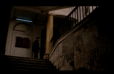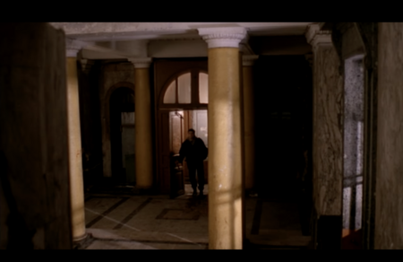 В композиции кадров заметно постоянное разделение пространства — герой часто оказывается внутри архитектурной рамки: между колоннами, дверными проёмами, арками.