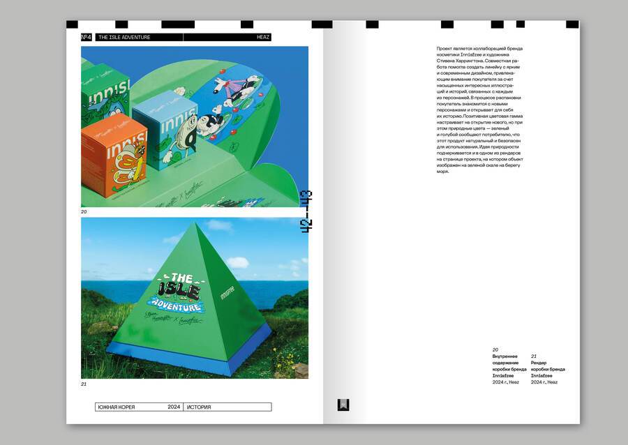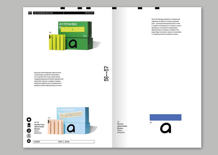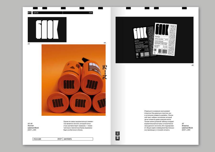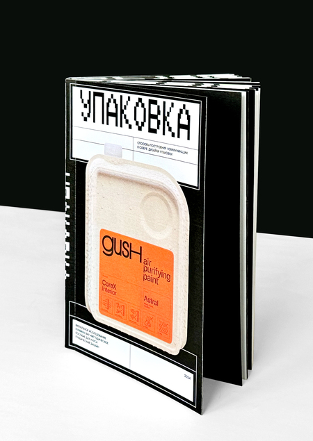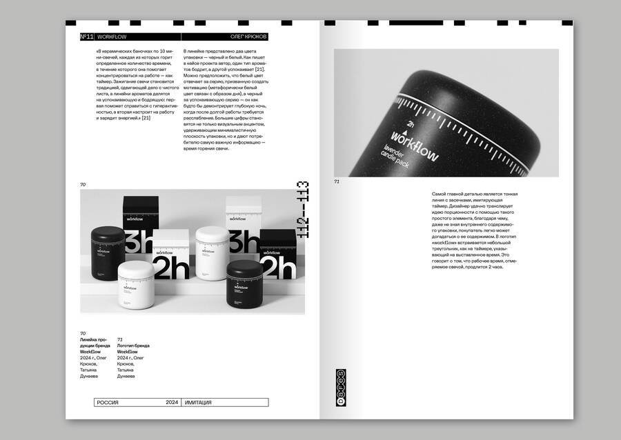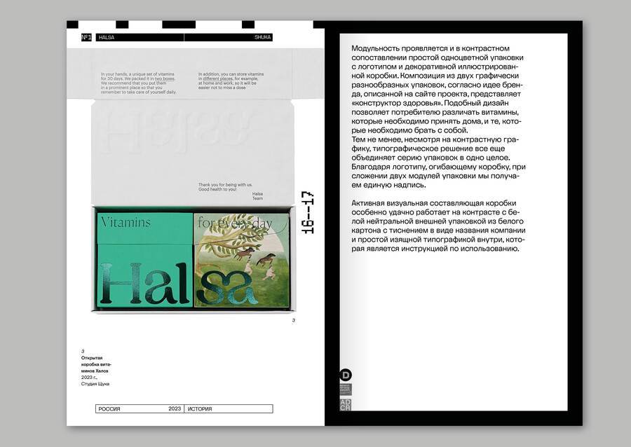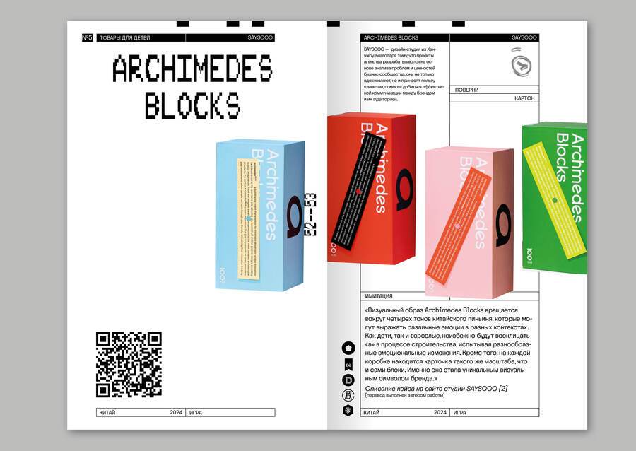 Все примеры сопровождаются «карточкой» товара, в которой содержится не только год, название и автор, цитата, но и данные о материале, если они известны. Это необходимо для того чтобы подчеркнуть важность тактильности и пространственности в упаковке, потому что именно они отличают ее от многих других сфер графического дизайна. Также на развороте содержится QR-код на страницу проекта и полученные им награды.