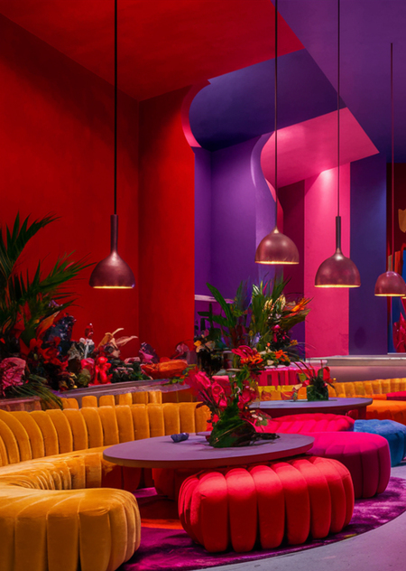 Prompt A stunning architectural rendering of a modern minimalist hookah bar, inspired by the vibrant and exotic artwork of Paul Gauguin. The interior is a captivating blend of bold colors — red, purple, blue, pink, and yellow — that create an enchanting atmosphere. The space features a lush, colorful garden with comfortable seating, perfect for relaxation. Hookahs and vivid soft furnishings complement the design, making it an ideal destination for socializing and unwinding., architecture