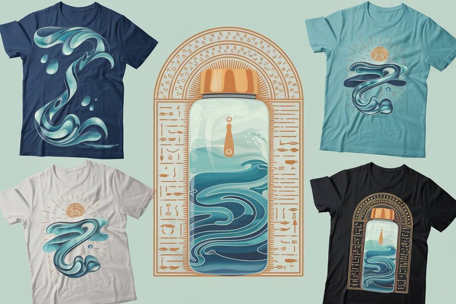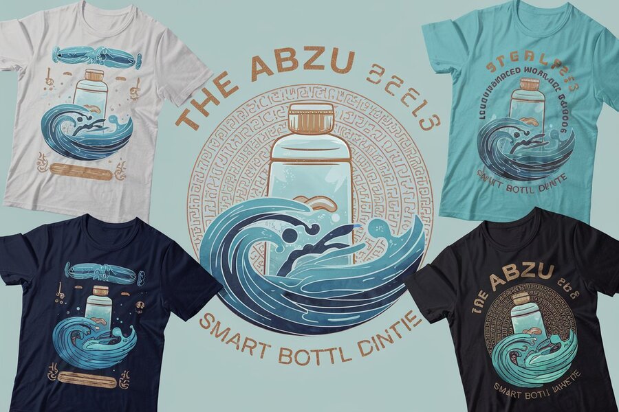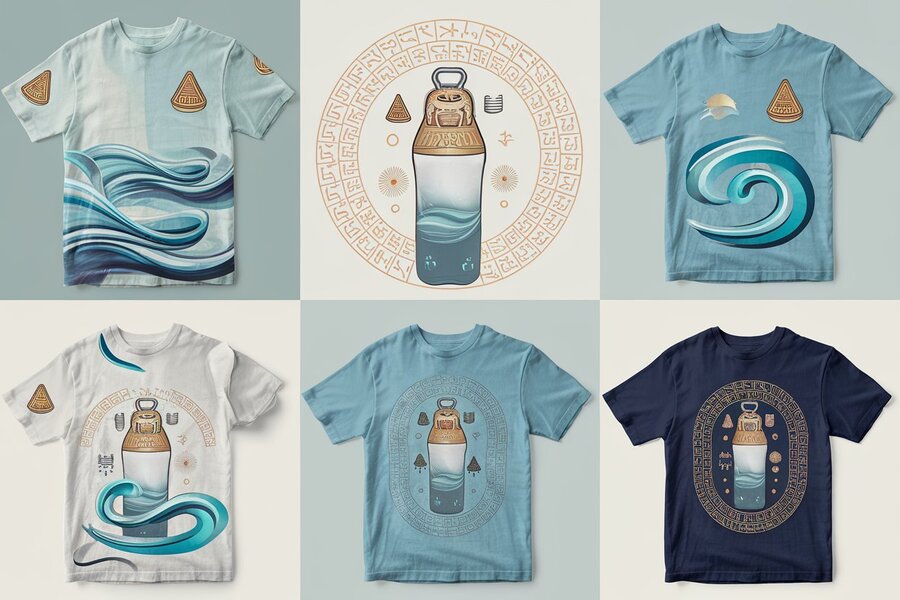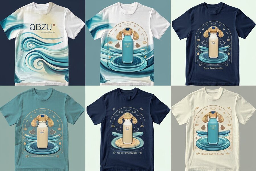 Промпт: «Design a collection of t-shirts for the ABZU smart bottle brand, combining water and Sumerian motifs. Use flowing water patterns, cuneiform symbols, and stylized depictions of the god Abzu. The color palette includes aquatic tones (blue, turquoise) with gold or sand accents. Include: