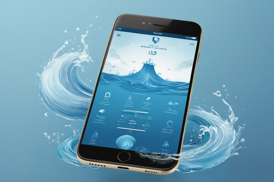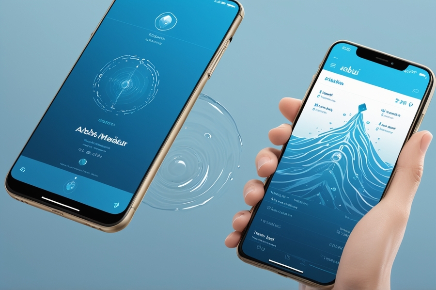 The phone mockup should show a sleek smartphone held in hand or floating against a soft, watery background, highlighting the app’s interface as a user-friendly yet visually rich design reflecting ABZU’s brand identity.»