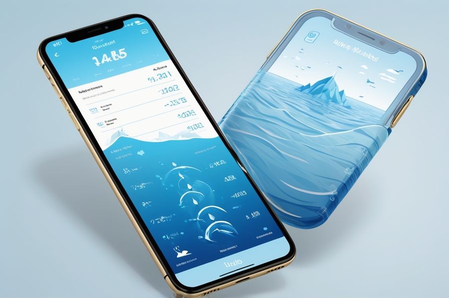 Main Screen: A water-themed dashboard showing the user’s hydration progress, represented visually as a rising water level in a stylized ancient Sumerian vessel or ziggurat-shaped container. Include percentage of daily water intake, remaining goal, and a soft blue gradient background reminiscent of flowing water.