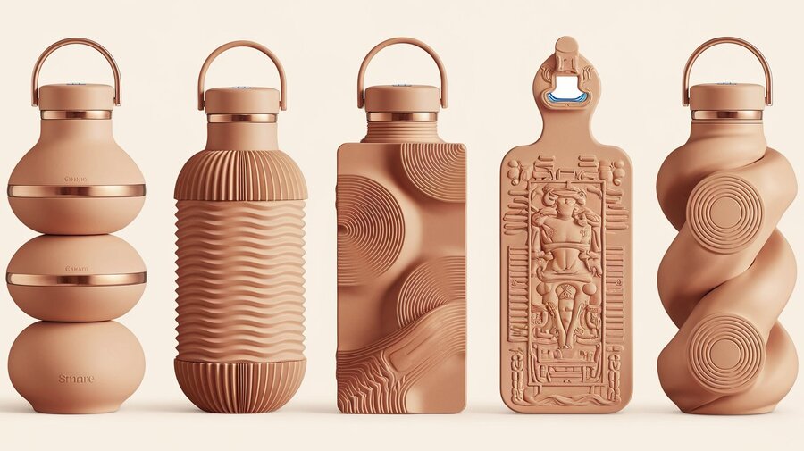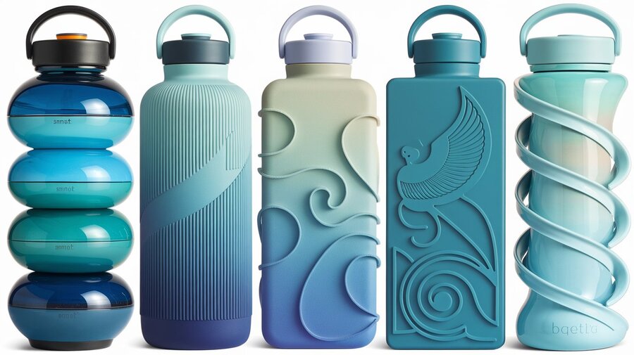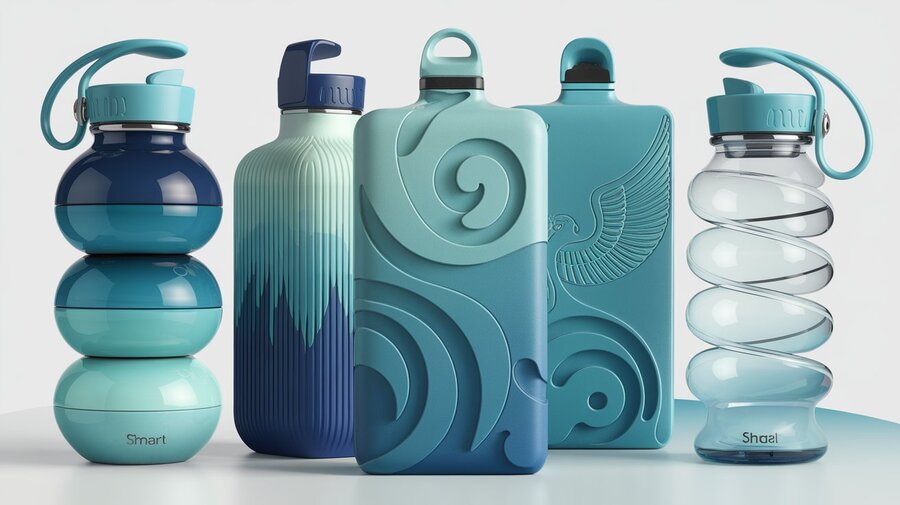 Промты бутылок по порядку: «The first bottle features a sleek, stacked-sphere design, resembling three large water droplets perfectly balanced. Its smooth, glossy surface in a gradient of turquoise blue reflects purity and fluidity, evoking the calmness of fresh water.