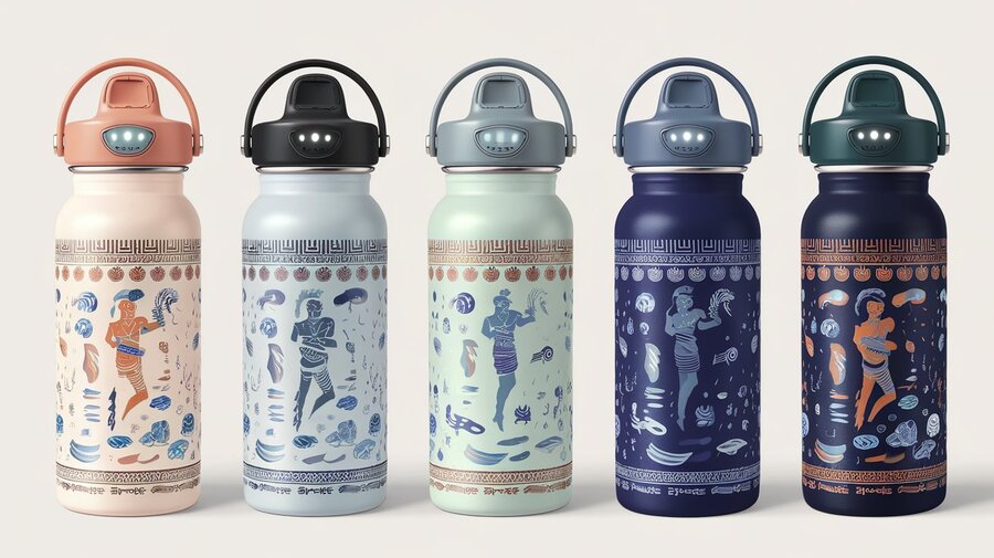 Промпт: «Create a mockup for a mobile app that monitors the user’s hydration and water consumption for the smart bottle brand ABZU. The app interface should blend clean modern design with water and Sumerian motifs. Key elements: