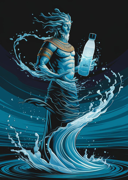 Промпт: «An epic illustrated poster featuring Abzu, the Sumerian god of the fresh ocean and the brand mascot. Abzu is depicted as a serene and mystical water figure, with flowing liquid waves forming his body and cascading into elegant shapes. He holds a glowing ABZU smart water bottle, water swirling around it to emphasize its purity and importance. The poster’s background is dark and atmospheric, resembling an endless ocean with luminous water effects. The ABZU logo stands prominent at the top.»