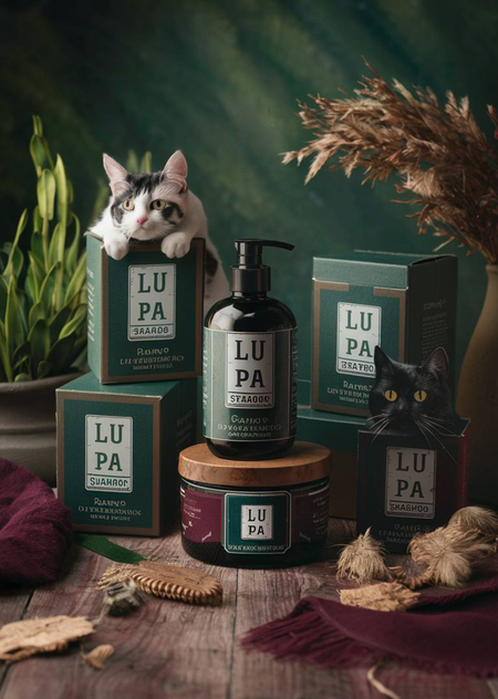 Generate a package of shampoo for cats from the Lu Pa cat detective agency. There should be several jars and boxes in the photo. The final render should look like a hyper realistic photo with lots of details. Beautiful, complementary colors: brown (wood), dark green and burgundy, photo
