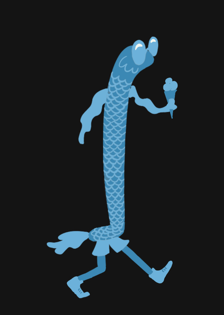 Рыбы на ножках — люди, которые приходят в Севкабель. Итоговая работа представляет собой 20 рыб, каждая из которых проживает свою историю: кто-то выгуливает собаку и пьёт кофе, кто-то купил изделия на ярмарке, а кто-то просто куда-то идёт.