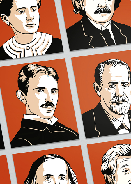 Проект представляет собой серию портретов наиболее известных деятелей в сфере науки. В качестве визуала была взята ограниченная неброская цветовая палитра и использованы чёткие контуры для соответствия серьезности тематики.