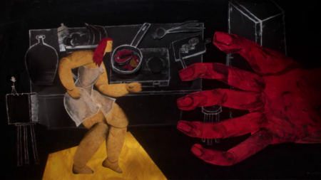 Гений места (Genius Loci, реж. Адриан Мерижо, 2022). Разные плоскости «преломляются» в одном изображении, создавая витражность — становится неясным, какая из плоскостей доминирует.