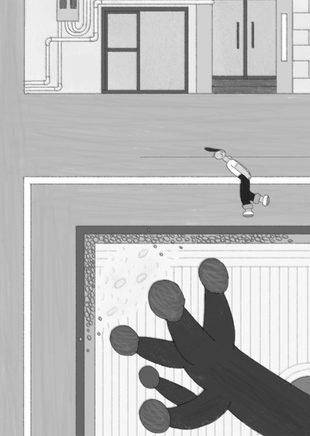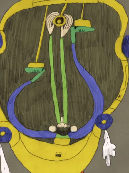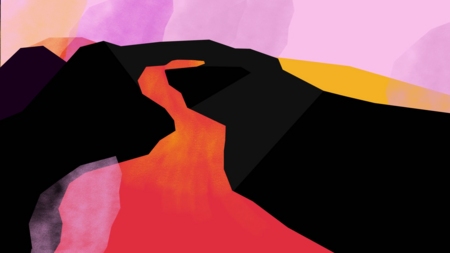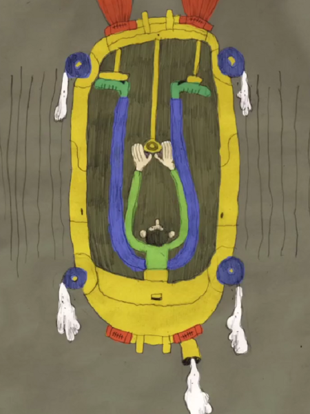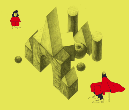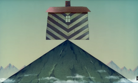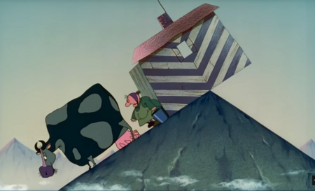 Аппликация и её буквальное восприятие формы как она есть (треугольник и прямоугольник) составляет основной гэг в мультфильме — дом качается на пике горы то вправо, то влево, меняя расстановку сил.