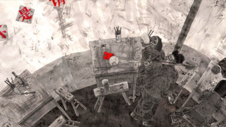 Этот способ уплощения кадра достигается за счет отсутствия объема на предметах — на них нет выраженных тени и света. Изображение представляет собой картинку-аппликацию.
