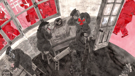 В мультфильме «Муха в ресторане» камера движется по кругу, создавая панораму кафе в Китае. Столики в кафе развернуты на зрителя, чтобы можно было подробно изучить каждого посетителя и его занятие.