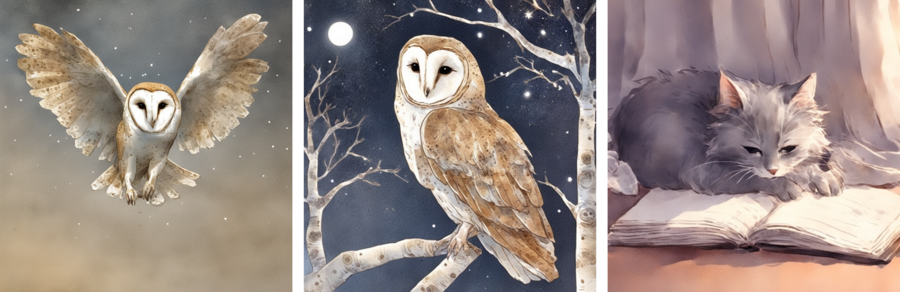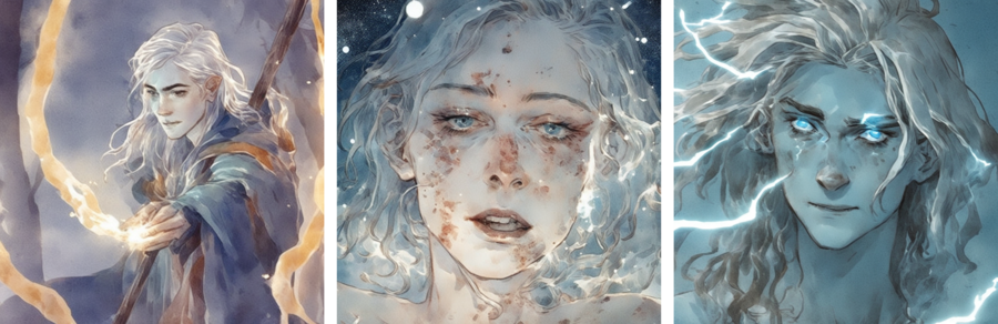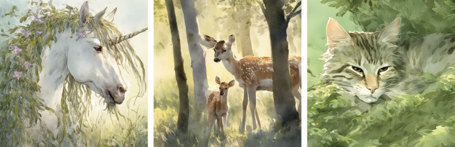 Работы художницы Jealiu привлекают своей нежной акварельной текстурой, мягкими цветами, плавными линиями и атмосферой мечтательности. Такой стиль идеально подходит для создания фэнтезийных миров, что и стало основой этого проекта. В процессе генерации изображений были выявлены повторяющиеся черты, которые позволили мне придумать серию персонажей и их историй.
